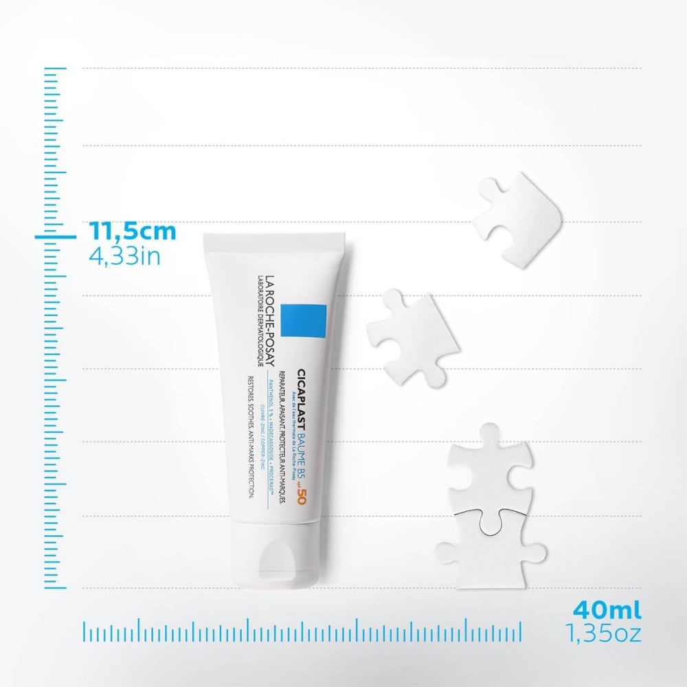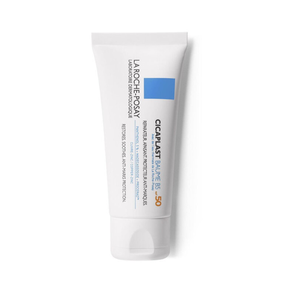 سيكابلاست بوم بي 5 بعامل حماية SPF 50 معزّز بالماديكاسوسيد، وهو مكون فعّال مرمّم، والبانثينول المهدئ، والنحاس، والزنك.